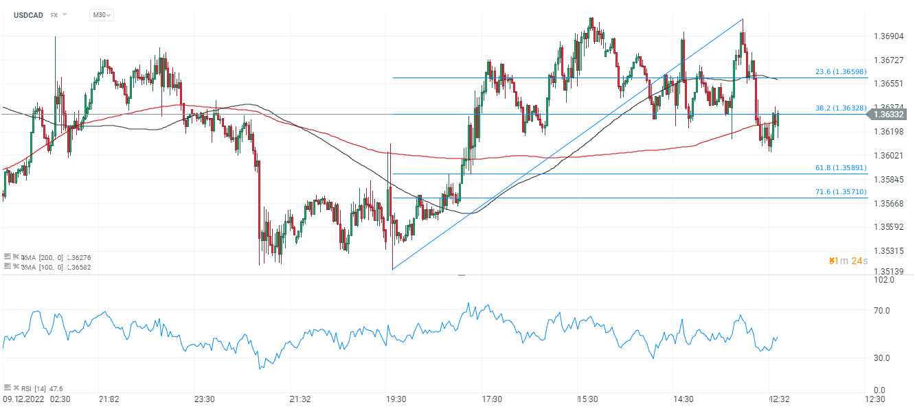 Dolar kanadyjski osłabia się wobec amerykańskiego dolara po raporcie. USDCAD wzbił się powyżej SMA200 (czerwona linia), wzrosty zostały zatrzymane na poziomie 1,362 przy 38.2 zniesieniu Fibonacciego.