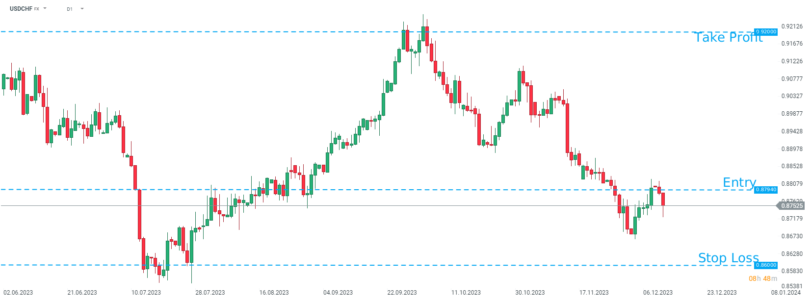 Barclays rekomenduje pozycję długą na USDCHF, po cenie rynkowej z cele 0,9200 i zleceniem obronnym stop loss, na poziomie 0,8600, Source: xStation5