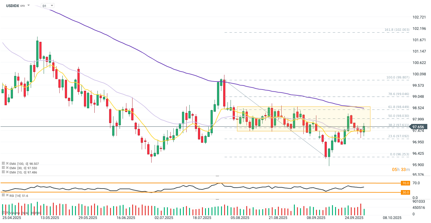 Dolar przerywa 4-dniową serię spadków pomimo utrzymującej się na początku sesji słabości. USDIDX zyskuje na ten moment ok. 0,3%, wracając tym samym do zakresu utrzymującej się na przestrzeni sierpnia i września konsolidacji.