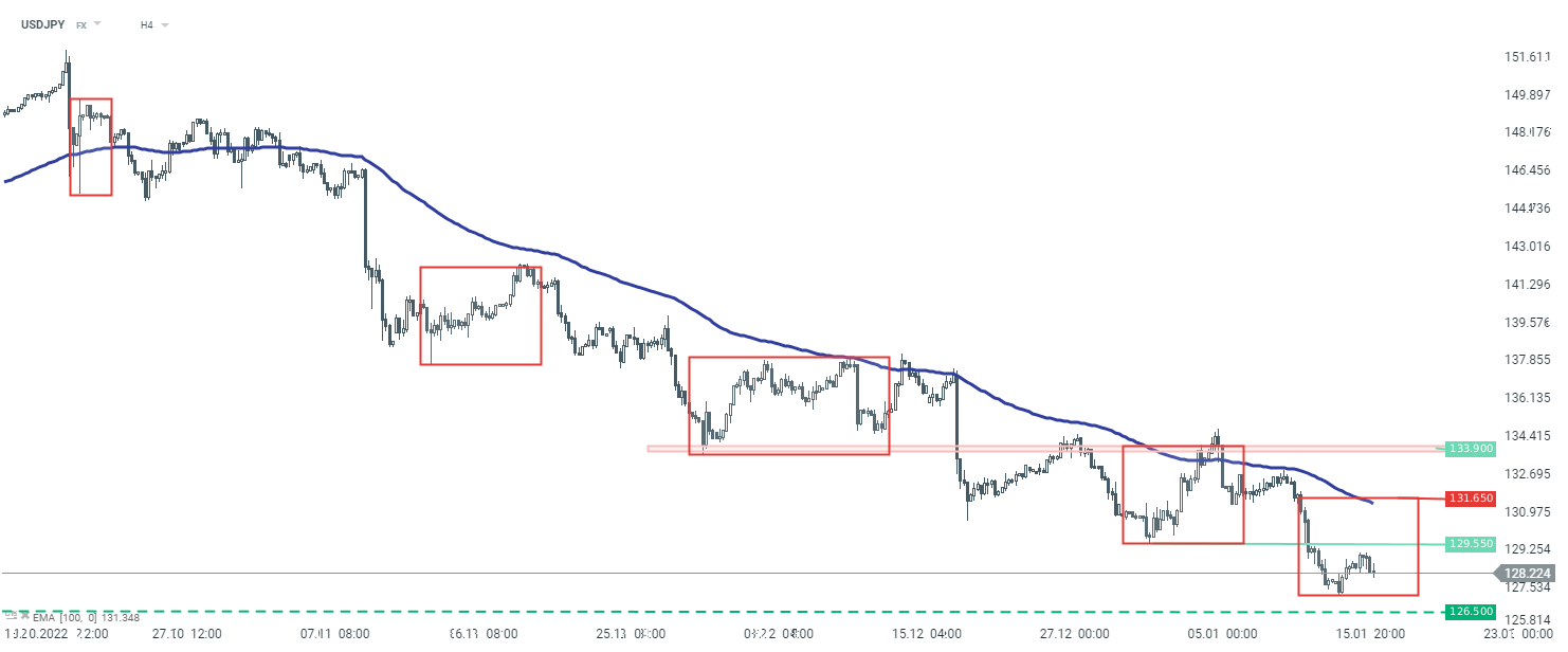 Notowania USDJPY od drugiej połowy października 2022 roku poruszają się w tendencji spadkowej. Patrząc technicznie na wykres H4, można zauważyć, że każdorazowe przetestowanie górnego ograniczenia układu 1:1 prowadziło do wygenerowania nowego impulsus spadkowego. Zgodnie z metodologią Overbalance, dopóki układ geometryczny nie zostanie zanegowany, obowiązuje niedźwiedzi sentyment. W przypadku rozszerzenia spadków, jako najbliższe wsparcie należy traktować poziom 126,50, gdzie wypadają dołki z maja 2022 roku. Najbliższy opór wypada przy 129,55 i wynika z ostatniego lokalnego dołka, a kolejnym ważnym miejscem jest górne ograniczenie układu 1:1 przy 131,65, które grupuje się ze średnią EMA100.