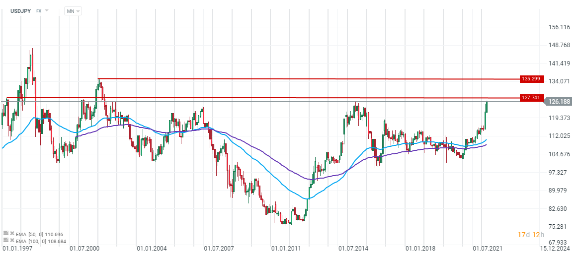 Wykres pary USD/JPY, interwał MN. Jen kontynuuje falę wyprzedaży, a dzisiejsze wypowiedzi przedstawicieli japońskiego establishmentu wsparły relacje niedźwiedzi. Para skoczyła dzisiaj do poziomów niewidzianych od 2002 roku i dopóki polityka monetarna BoJ nie przyjmie bardziej stanowczego tonu, dopóty waluta Kraju Kwitnącej Wiśni może znajdować się pod silną presją. Źródło: xStation 5