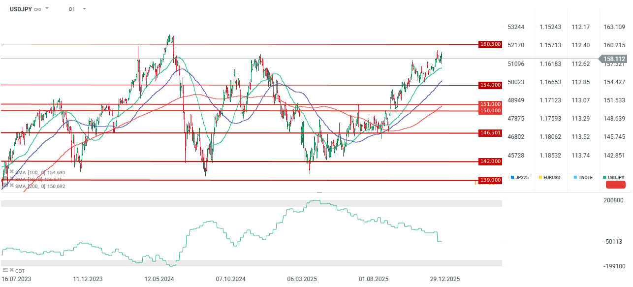 USDJPY nieco wyhamowuje trend wzrostowy i pomimo ostatniej paniki związanej z rentownościami, jen nie zwiększa znacząco słabości. Choć istnieje przestrzeń do przetestowania poziomu 160, ważnym sygnałem mogłoby być przekroczenie średniej 50 okresowej. Przełamanie tej średniej mogłoby doprowadzić do sporej korekty, nie tylko do zakresu 150-151, ale teoretycznie niżej, jeśli sytuacja w Japonii ustabilizuje się, a rynek wciąż będzie rozgrywał scenariusz “SELL America”. Źródło: xStation5