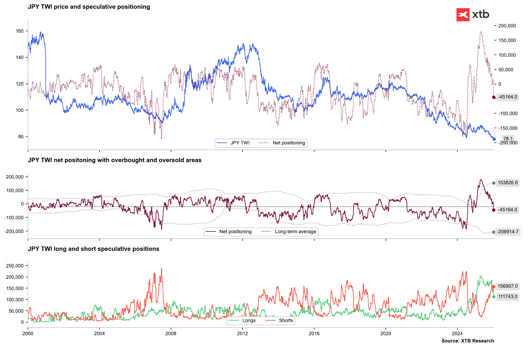 W ostatnim czasie obserwujemy ekstremalną redukcję longów i kontynuację przyrostów shortów. Obecnie pozycje netto znajdują się przy długoterminowej średniej na poziomie negatywnym. Jeśli jednak pozycje netto spadną do okolic ok. -100 tysięcy kontraktów, może to stanowić sygnał kontrariański. Co więcej, ekstremalna ilość shortów zawsze może doprowadzić do squeezu, tak jak było to np. w 2024 roku. Źródło: Bloomberg Finance LP, XTB