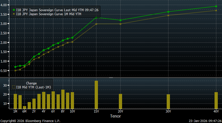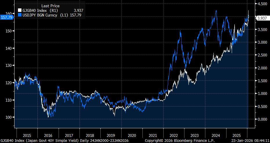 Rentowności 40 letnich japońskich obligacji wzrosły do poziomu 4% pierwszy raz w historii. Jak widać znaczny wzrost rentowności wcale nie sprzyjał jenowi, choć jednocześnie należy też pamiętać, że zazwyczaj wzrost rentowności na świecie idzie w parze - wraz z umiarkowanym wzrostem rentowności w USA, mamy również wzrosty w Japonii. Bardzo silny wzrost od 2022 to jednak efekt polityki fiskalnej, obaw o deficyt i długoterminowe przestrzelenie inflacji. Stopy procentowe, które działają na krótki koniec krzywej, mają ograniczony wpływ na długoterminowe obligacje, w szczególności te 40 letnie. Źródło: Bloomberg Finance LP