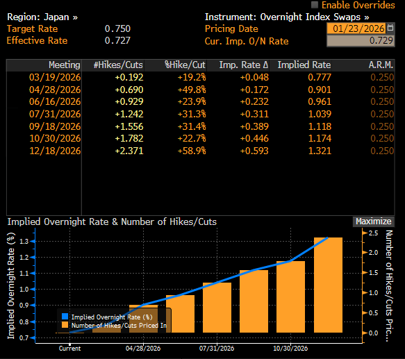 Bank Japonii utrzymał stopy procentowe bez zmian, z główną stopą procentową na poziomie 0,75%. Z drugiej strony projekcje banku dotyczące wzrostu i inflacji wydają się być bardzo jastrzębie, ale przynajmniej na ten moment nie pomogło to jenowi, który boryka się z problemami wpływu perspektyw polityki fiskalnej. Niemniej oczekuje się, że Bank Japonii powróci do podwyżek stóp procentowych, choć pierwszy ruch oczekiwany jest dopiero w połowie roku. Rynek wycenia obecnie nieco ponad 2 podwyżki w tym roku, choć niektóre banki jak CIti widzą nawet 3 ruchy w tym roku.