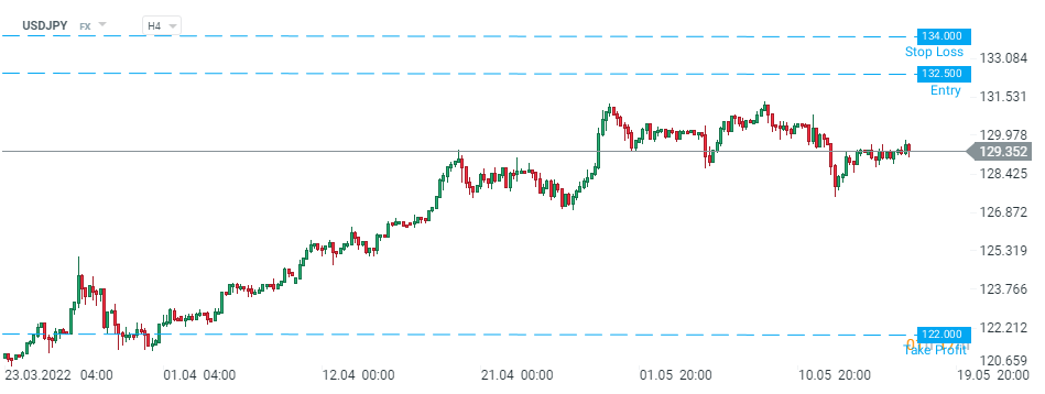 Barclays zaleca zajęcie krótkiej pozycji na USDJPY po cenie 132.50 (zlecenie oczekujące), z targetem na 122.00 i zleceniem stop loss umieszczonym na 134.00. Źródło: xStation5