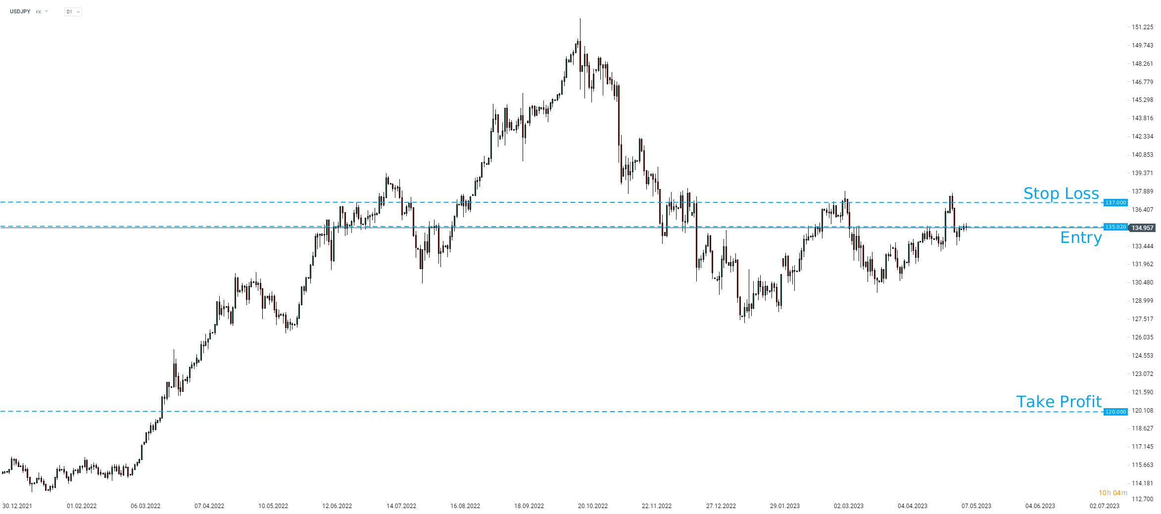 Morgan Stanley zaleca zajęcie krótkiej pozycji na parze USDJPY po cenie rynkowej z celem na poziomie 120,00 i zleceniem stop loss umieszczonym na poziomie 137,00. Źródło: xStation 5