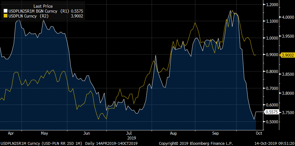 Patrząc w krótkim terminie na słabość polskiego złotego może wydawać lekko przesadzona. Wskaźnik odwrotu ryzyka pokazuje właśnie możliwe niedowartościowanie złotego. Z drugiej strony w dalszym ciągu widać przewagę opcji call nad opcjami put, biorąc pod uwagę pozytywną wartość indeksów.
