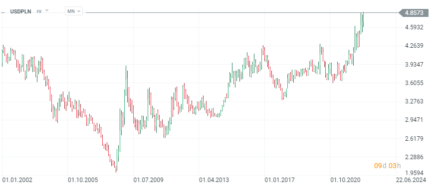 Para USDPLN, interwał W1. Kurs walutowy osiągnął poziom 4.86 i przebił poprzednie szczyty z lipca tego roku. Źródło: xStation5