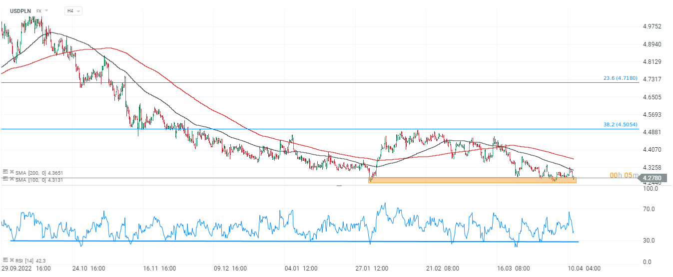 Wykres USDPLN, interwał H4. Dolar osłabił się w relacji do złotego o blisko 15% od rekordowych wycen powyżej 5 PLN z IV kw. 2022 roku. Średnia SMA200 została w połowie marca przecięta od góry przez SMA100 sygnalizując niedźwiedzią formację 'krzyża śmierci'. Niedźwiedzie mogą mieć jednak problem ze sprowadzeniem USD poniżej poziomu 4,27, który wyznaczają poprzednie reakcje cenowe. Źródło: xStation5