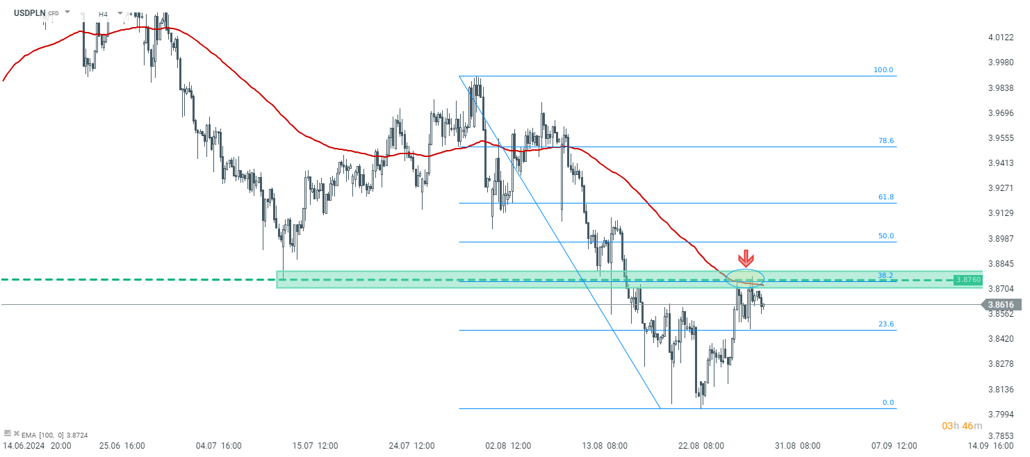Schodząc na niższy przedział czasowy - H4, widać potwierdzenie oporu przy 3,8760 zł. Miejsce to wynika nie tylko z wcześniejszych reakcji cenowych ale takżę ze śedniej EMA100. Dopóki kurs znajduje się poniżej, należy spodziewać się rozwinięcia spadków. Z drugiej strony, przypadku jego zanegowania ruch w górę może przybrać nas sile.