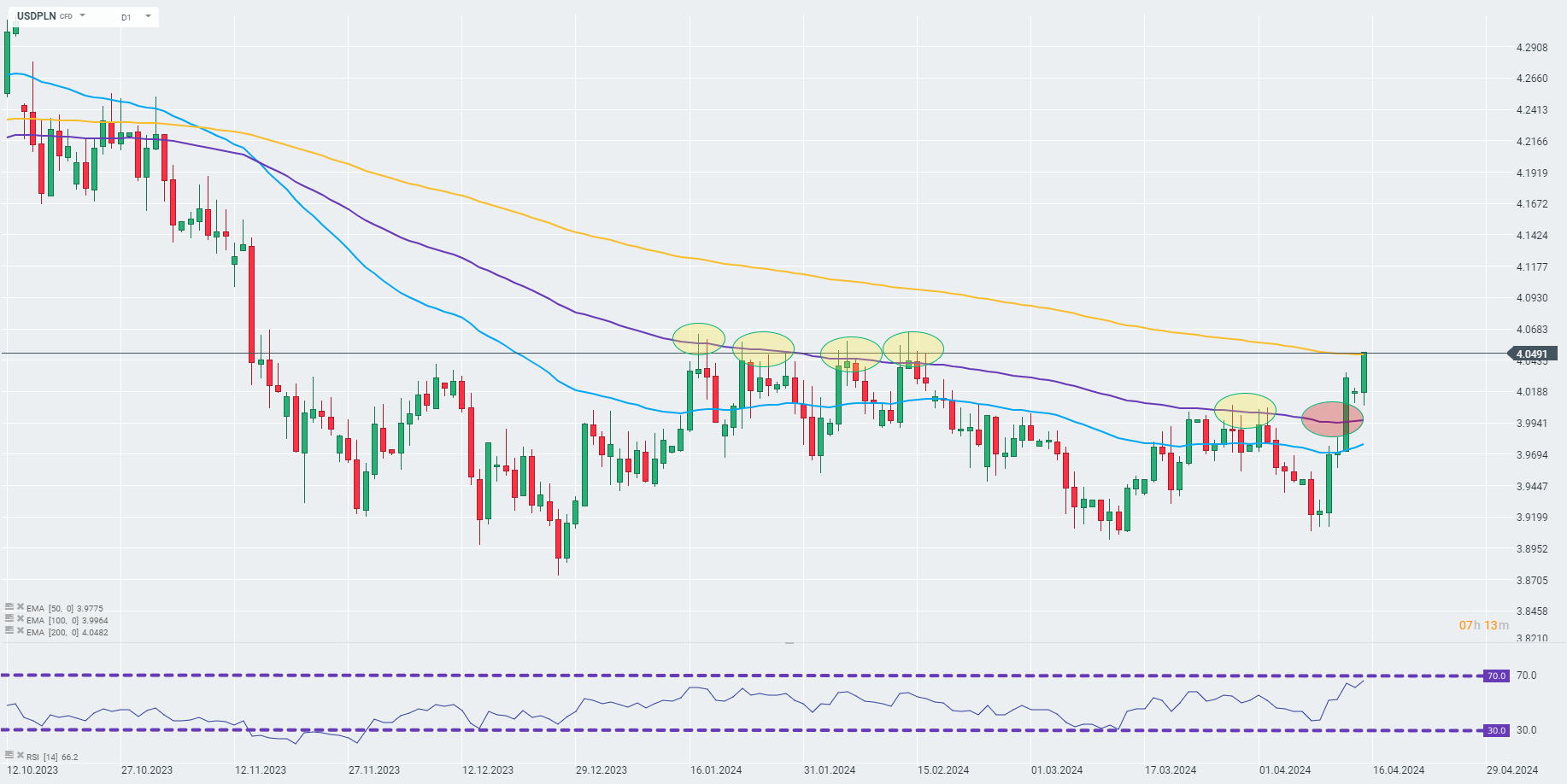 Początek tygodnia przynosi kontynuację byczego trendu na dolarze amerykańskim. Waluta rezerwowa świata jest zaraz po dolarze kanadyjskim najlepiej radzącą sobie przystanią na rynku FX, co ma duże implikacje dla polskiego złotego. Para USDPLN po raz pierwszy od listopada 2023 roku testuje poziom oporowy wyznaczony przez 200-dniową wykładniczą średnią kroczącą (złota krzywa na wykresie), która w historii decydowała często o długoterminowym trendzie obserwowanym na tej walucie.