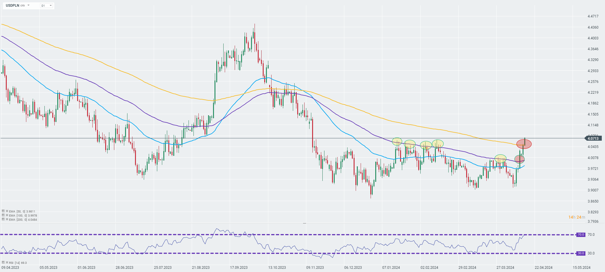Słabe nastroje inwestorów na początku wtorkowej sesji giełdowej po raz kolejny wznoszą dolara amerykańskiego na piedestał. Waluta rezerwowa świata jest obecnie najlepiej radzącą sobie przystanią na szerokim rynku FX i tym samym nakładą dużą presją sprzedażową na polskiego złotego. Para USDPLN wybiła się dzisiaj powyżej 200-dnioweje EMA (złota krzywa na wykresie), sytuacji nieobserwowanej od listopada 2023 roku.