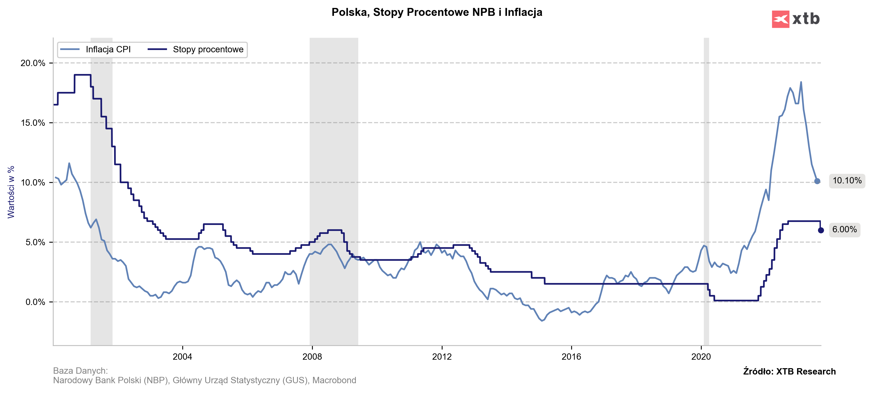 Inflacja w Polsce jest wciąż dwucyfrowa (ostatni odczyt za sierpień na poziomie 10,1%) i około 8% powyżej celu. Źródło: XTB Research, NBP, GUS