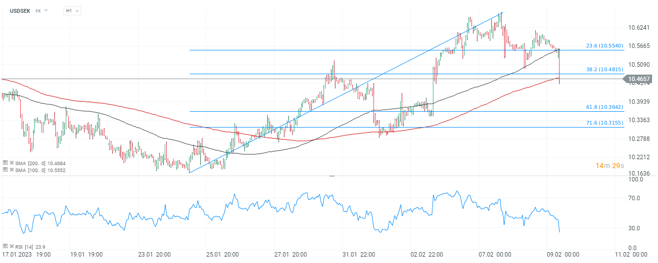 Para USDSEK gwałtownie spadła po tym jak Riksbank zgodnie z oczekiwaniami rynku podniósł stopy procentowe w Szwecji o 50 punktów bazowych, wzmacniając szwedzką koronę. Już przed decyzją para przełamała się poniżej lokalnej linii trendu wzrostowego, a ostatnia decyzja dostarczyła więcej paliwa niedźwiedziom. Para osunęła się poniżej średniej SMA100 (czarna linia) i SMA200 (czerwona linia) sygnalizując osłabienie. Jeśli trend spadkowy się utrzyma, poziomem wartym obserwacji wydaje się 61,8 zniesienie Fibonacciego fali wzrostowej rozpoczętej w końcówce stycznia, w okolicach 10,36 jednak osiągnięcie go może być trudne po ostatnich, jastrzębich komentarzach członków Fed i wciąż dobrej kondycji amerykańskiej gospodarki. Byki wciąż mają szansę obronić wzrostowy trend i odbić się po spadku poniżej SMA200 w kierunku 10,48 - poziomu wyznaczonego przez 38,2 zniesienie Fibonacciego.