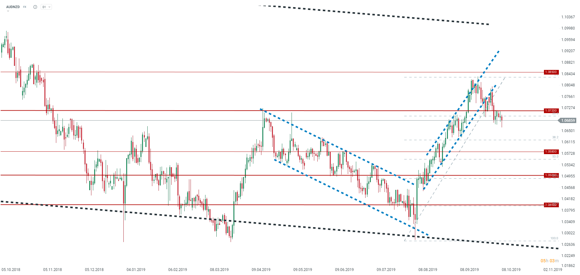 AUDNZD kontynuuje spadki, choć buduje się strefa popytowa powyżej poziomu 1,0680. Źródło: xStation5