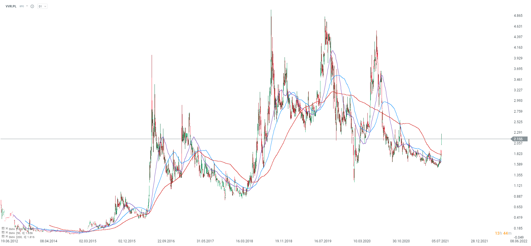 Widzimy, że historia ostatnich 3 lat notowań była bardzo burzliwa. Spółka w przeciągu kilku tygodni czy miesięcy potrafiła zyskiwać ponad kilkaset procent, ale z drugiej strony nigdy nie wywiązał się stały trend. Obecnie obserwujemy wybicie się z umiarkowanego trendu spadkowego, który oznaczał spadające zainteresowanie akcjami spółki. Obecna sytuacja zaczyna przypominać maj 2018 roku, kiedy po umiarkowanych spadkach rozpoczęły się dosyć dynamiczne wzrosty. Teraz te wzrosty rozpoczęły się zaraz na początku sierpnia. Źródło: xStation5