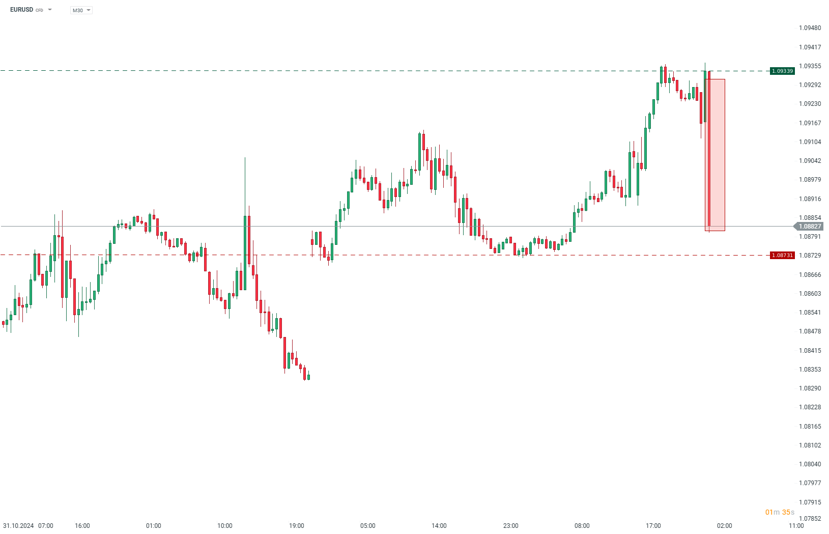 W pierwszej reakcji na wyniki para EURUSD spada o prawie 0,5%, zbliżając się do minimów z poprzedniego dnia. Źródło: xStation