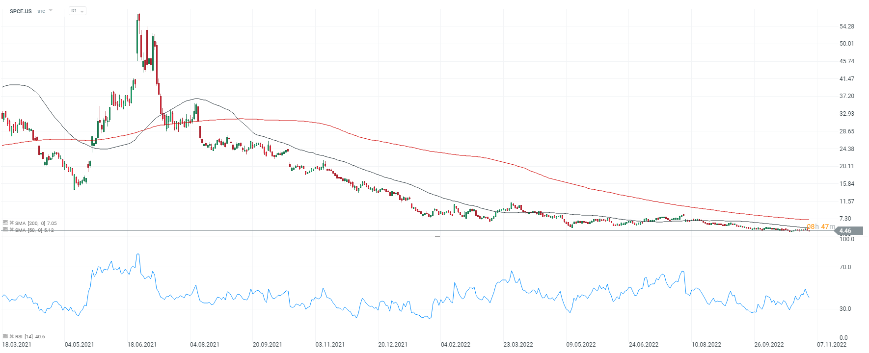 Akcje Virgin Galactic (SPCE.US), intrwał D1. Walory poruszają się w dynamicznym trendzie spadkowym i znajdują się na historycznych minimach. Fatalny sentyment inwestorów pokazuje fakt, że akcje notowane są zarówno poniżej średniej SMA50 jak i SMA200. Wydaje się, że dopóki spółka nie zorganizuje zakończonego sukcesem, kolejnego turystycznego lotu w kosmos i nie zwiększy floty statków rynek wciąż będzie wątpił w koncepcję 'galaktycznego biznesu' twórcy spółki, Richarda Bransona. Źródło: xStation5