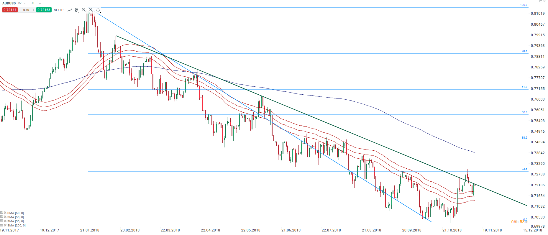 AUDUSD walczy na spadkowej linii trendu. Ostatnie wzrosty zatrzymały się na poziomie 23,6% ostatniej fali spadkowej. Czy raport z rynku pracy będzie życzliwy dla australijskiej waluty? Źródło: xStation5.