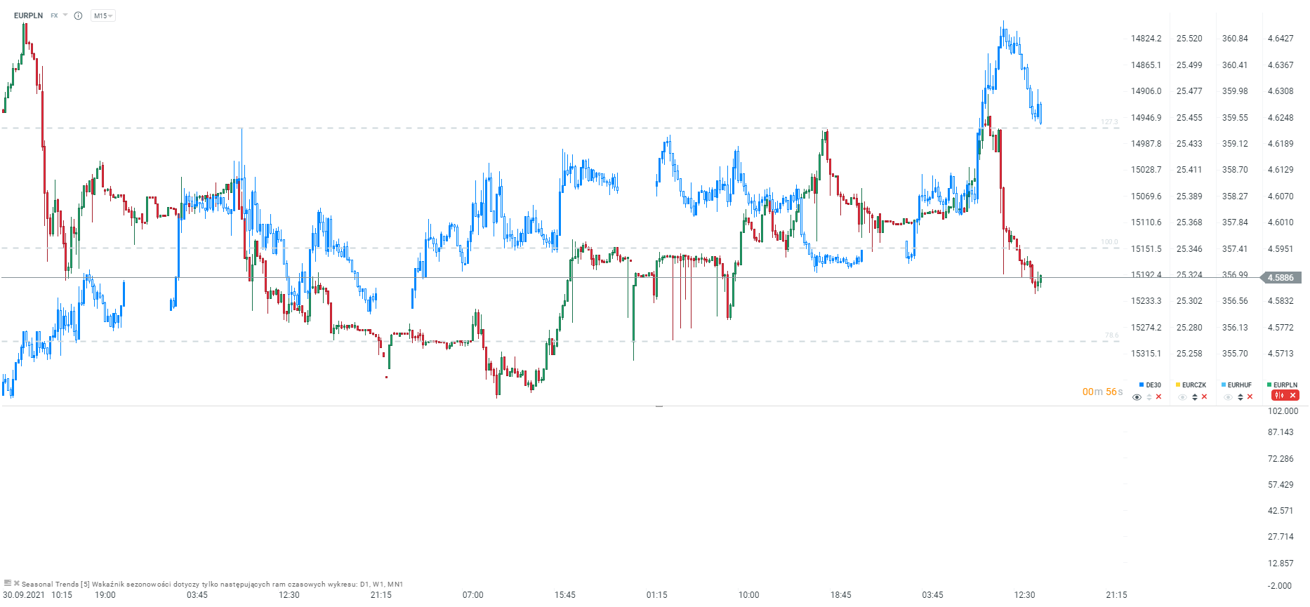 Początkowa słabość złotego podczas dzisiejszej sesji była związana z globalnym sentymentem. Tracił również forint, korona czeska, DE30 tracił. Obecnie obserwujemy znacznie mocniejszego złotego. Źródło: xStation5