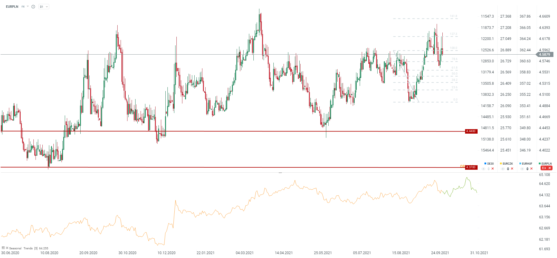 Para EURPLN jest dosyć zmienna w ostatnim czasie, ale rozstrzał pomiędzy najwyższym oraz najniższym poziomem to już prawie 5 groszy. Dzisiaj odbywa się kolejna decyzja Rady Polityki Pieniężnej. Rynkowy konsensus zakłada brak zmian, ale dzisiaj mamy do czynienia z głosem ze strony premiera Mateusza Morawieckiego, który wskazuje, że ma nadzieję, że NBP upora się z inflacją. Tym samym rynek mógł to odebrać jako nakłanianie oraz zielone światło do podwyżki stóp procentowych. Przypomnijmy, że inflacja w Polsce wymosi 5,8%!