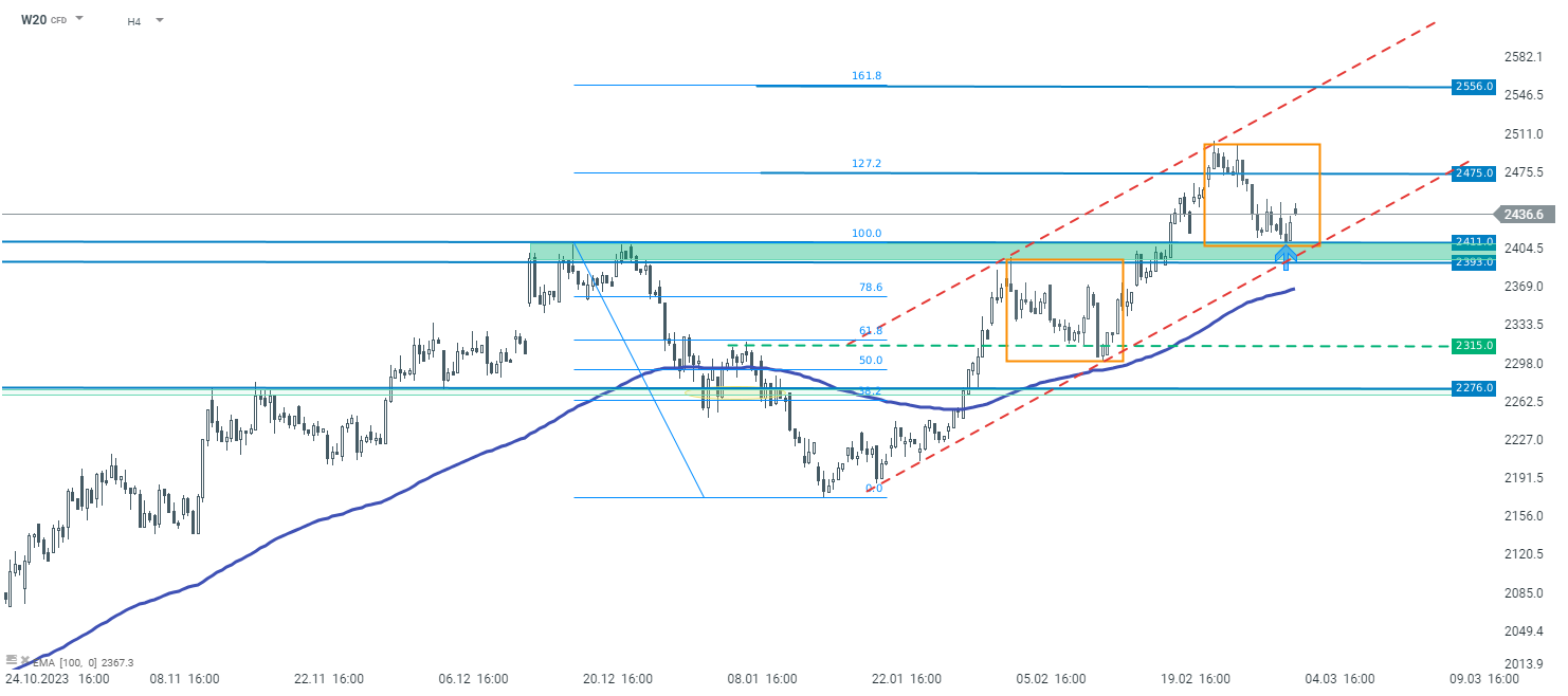 Notowania W20 od pewnego czasu poruszają się w tendencji wzrostowej. Patrząc na wykres H4, kurs utrzymuje się w kanale wzrostowym. Pod koniec ubiegłego tygodnia cena dotarła do wsparcia wynikającego z dolnego ograniczenia układu 1:1 (pomarańczowe prostokąty), gdzie pojawili się kupujący. Zgodnie z założeniami metodologii Overbalance, tendencja pozostaje wzrostowa. W przypadku utrzymania obecnego sentymentu istnieje szansa na atak ostatnich maksimów przy 2500 pkt. Jeśli dojdzie do ich przebicia, kolejnym celem dla kupujących będzie poziom 2556 pkt, który wynika z mierzenia 161,8% ostatniej korekty oraz górnego ograniczenia kanału wzrostowego.