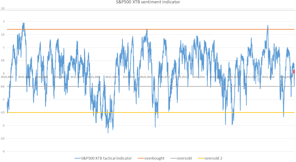 Pogarszające się perspektywy makro nie muszą od razu oznaczać bessy, co widać było choćby w tym roku. Dlatego warto wspomagać się wskaźnikami sentymentu. Widoczny na wykresie wskaźnik jest kombinacją 5-miar, gdzie skrajne wartości oznaczają, że rynek jest zbyt optymistyczny lub zbyt pesymistyczny. Widać, że w grudniu mieliśmy skrajny pesymizm, w maju również był on znaczny, tymczasem po ostatniej przecenie nastroje są jedynie neutralne.