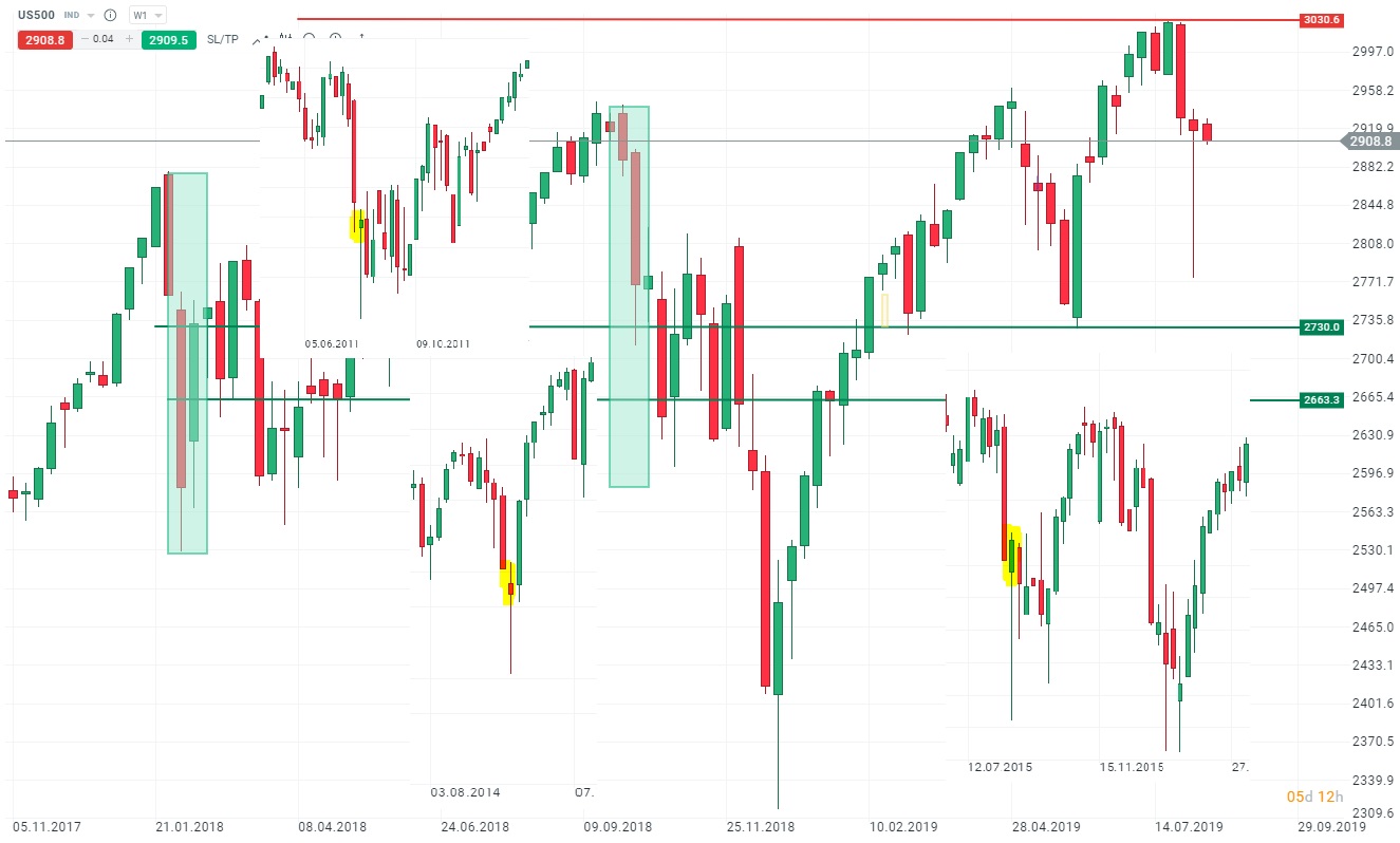 Na wykresie US500 mamy arcyciekawą sytuację. Po tygodniu mocnych spadków mamy świecę z małym korpusem i potężnym dolnym cieniem. Książkowo oznaczałoby to siłę popytu i powrót do wzrostów. W tej dekadzie układ: świeca spadkowa + tego rodzaju młot przytrafił się 3-krotnie. Raz faktycznie zapowiadał mocne wzrosty (2014), jednak dwukrotnie zwiastował przedłużenie spadków (2011 oraz 2015). Do tego ostatnie dwie sytuacje z pierwszą silną spadkową świecą z ostatnich miesięcy kończyły się dość głębokimi spadkami, których powtórzenie teraz oznaczałoby spadek poniżej 2700 pkt. (okolice 2670 pkt.)