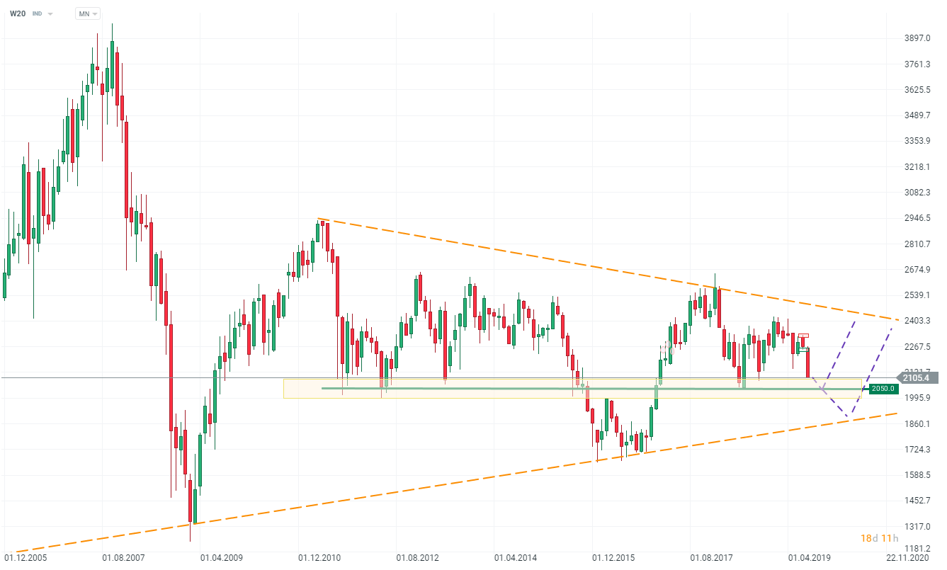 Pogorszenie nastrojów na rynkach globalnych odciska piętno na i tak słabym rynku polskim. Kluczowa będzie tu strefa 2050 pkt., która wcześniej wielokrotnie była okazją do zakupów. Bardzo długookresowa linia trendu znajduje się ok. 200 pkt. niżej.
