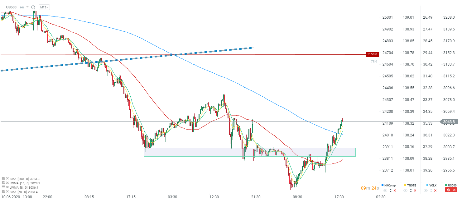 S&P 500 zyskuje dzisiejszego dnia po otwarciu dzisiejszym w okolicach 3000 punktów. Z kolei od dziennych dołków z początku sesji europejskiej odbicie wynosi już niemal 4%. Źródło: xStation5