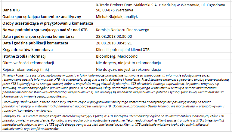 Na rynku walutowym warto zwrócić na amerykańskiego dolara, który próbuje odrabiać ostatnie straty. Wzrosty dolara, biorąc pod uwagę indeks nie są zbyt duże i wynoszą o poranku 0,1%. Dolar jednak zyskuje przede wszystkim wobec walut EM. W tym wypadku wobec niego tracą takie waluty jak ZAR, MXN oraz TRY, który zniżkuje 0,8%. Oczywiście nie sposób wspomnieć o meksykańskim peso, które w ostatnim czasie wyraźnie zyskuje, a w szczególności zyskiwało wczorajszego dnia ze względu na przejściowe porozumienie dotyczące handlu ze Stanami Zjednoczonymi. Na co zgodziły się obie strony? Warto zwrócić przede wszystkim uwagę na to, że Donald Trump w swoim wystąpieniu wskazał, że nowe porozumienie będzie potężne dla amerykańskich farmerów oraz pracowników. Według Stanów Zjednoczonych, zmieniona umowa (lub nowa jeśli Kanada wycofa się się z negocjacji) będzie zawarta z klauzulą wygaśnięcia, co oznacza, że według ustaleń będzie obowiązywała przez 16 lat i będzie ulegała przeglądowi co 6 lat. Oprócz tego, nowe porozumienie będzie wymagało, że 75% części w samochodach sprzedawanych w USA ma pochodzić z USA lub Meksyku, w porównaniu do poprzedniej umowy zakładającej 62%. Warto zwrócić uwagę, że ta kwestia była najbardziej sporna w przypadku zatargu handlowego w Ameryce Północnej. Oprócz tego, porozumienie wymaga, że 40-45% części ma być wykonanych przez pracowników zarabiających przynajmniej 16 dolarów na godzinę. Warto wspomnieć, że bez Kanady można wprowadzić jakiekolwiek zmiany do umowy. W związku z tym, Kanada musi powrócić do negocjacji albo porozumienie o wolnym handlu musi być zmienione. Po oświadczeniu, miało dojść do rozmowy pomiędzy Trumpem oraz Trudeau, który miał z zadowoleniem przyjąć postępy w rozmowach.