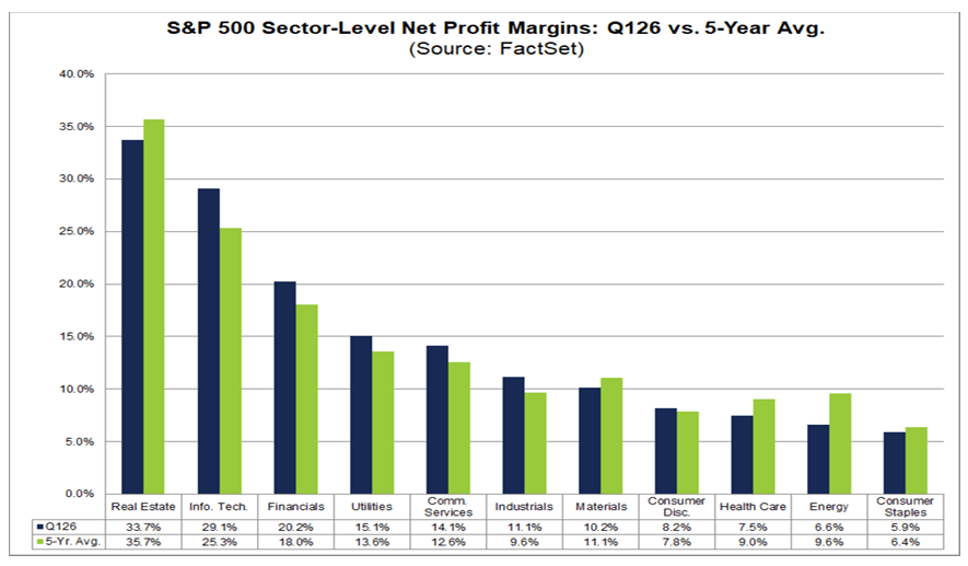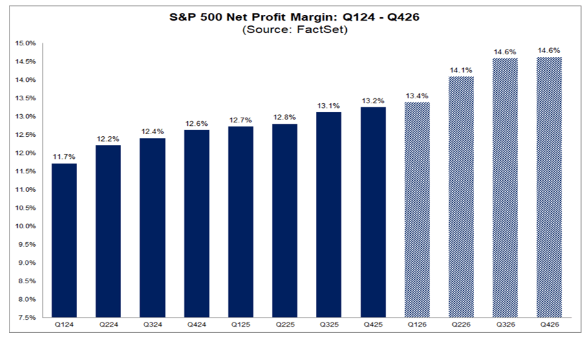 - Łączna, średnia marża zysku netto dla S&P 500 w I kwartale 2026 wg. FactSet wynosi 13,4%, co – jeśli się utrzyma – będzie najwyższym poziomem od rozpoczęcia pomiarów przez FactSet w 2009 roku (poprzedni rekord to 13,2% w poprzednim kwartale).