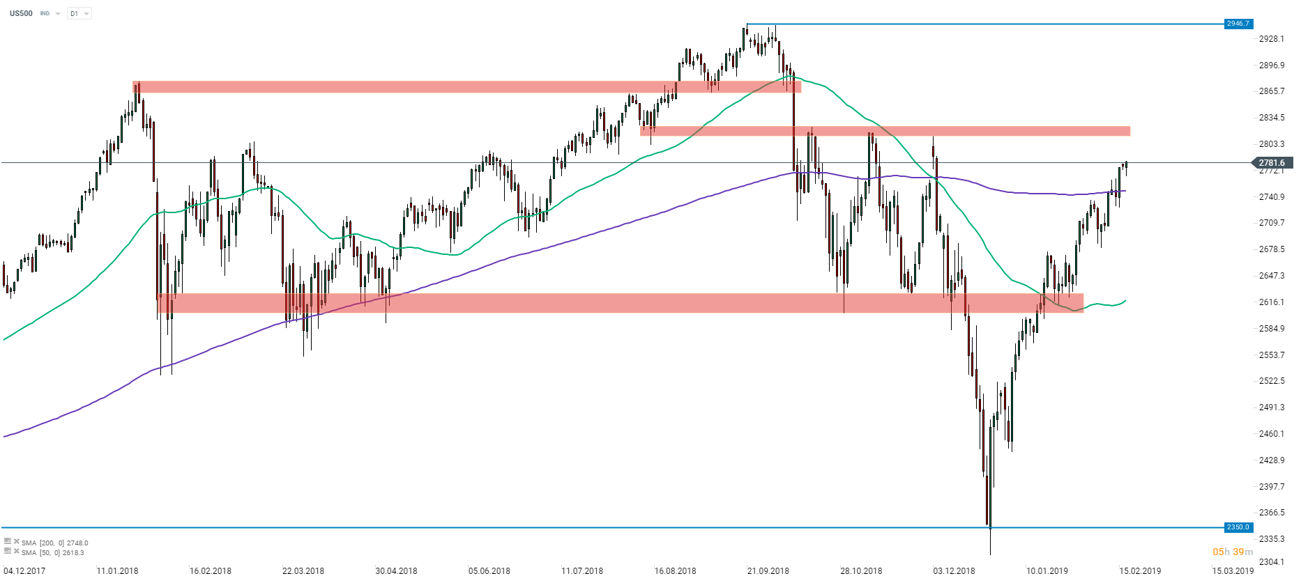 US500 kontynuuje wzrosty powyżej 200-sesyjnej średniej kroczącej (fioletowa linia na wykresie). Amerykański indeks znajduje się około 30 punktów poniżej strefy oporu, która ograniczała ruchy wzrostowe w ostatnim kwartale ubiegłego roku. US500 znajduje się już tylko 5,5% poniżej historycznego szczytu przy poziomie 2946,7 pkt. Źródło: xStation5