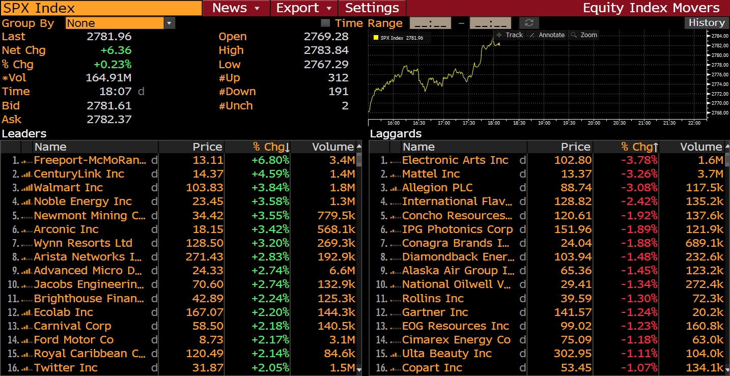 Walmart (WMT.US) i Freeport-McMoRan wśród dzisiejszych liderów indeksu S&P 500. Źródło: Bloomberg
