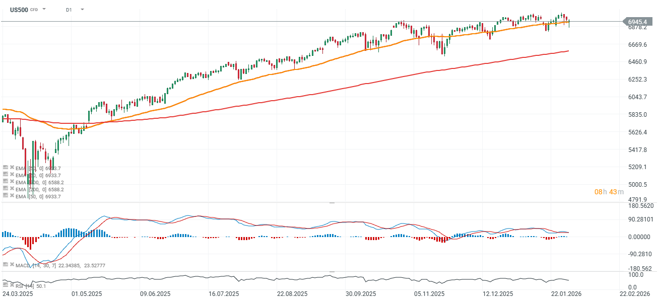 Kontrakt na indeks S&P500 (US500) szybko wrócił powyżej 50-sesyjnej średniej (EMA50) na interwale dziennym i ponownie oscyluje w pobliżu 6950 punktów. Solidne wyniki firm wspierają hossę i ograniczają negatywne czynniki momentum.