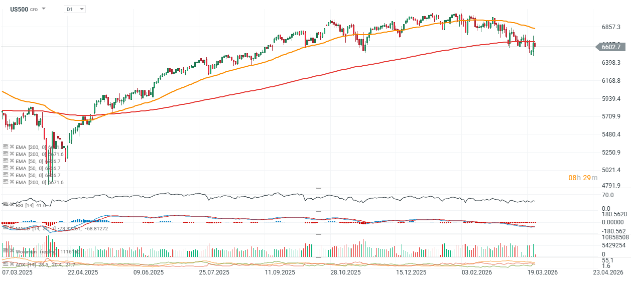 Nastroje na rynkach pozostają chwiejne, ponieważ inwestorzy próbują wycenić szerokie spektrum możliwych scenariuszy związanych z konfliktem na Bliskim Wschodzie, przy jednoczesnych, niejednoznacznych sygnałach dyplomatycznych płynących z Waszyngtonu. Kontrakty na S&P 500 spdają o 0,8%, wcześniej wahając się między wzrostami a spadkami, a rynek jest niepewny. Brak deeskalacji między USA i Izraelem a Iranem zwiększa ryzyko recesji podczas gdy szybkie porozumienie mogłoby wywołać odbicie. Akcje technologiczne notują poważne spadki, a presja podażowa widoczna jest w branży oprogramowania.
