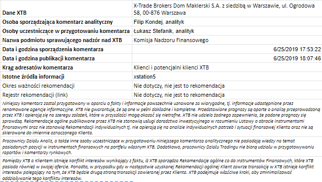 Dow Jones (US30) jest jedynym z 3 głównych indeksów amerykańskich, które nie zdołały wykonać ruchu w górę w drugim kwartale 2019 roku. Indeks wrócił nieco poniżej ubiegłorocznego maksimum wynoszącego 26960 pkt. USA30 testuje obecnie poziom wsparcia na wysokości podwójnego sczytu z kwietnia (26650 pkt). Zamknięcie się dziś poniżej tego poziomu może zachęcić niedźwiedzie do większej aktywności, a tym samym do pogłębienia spadków. W takim scenariuszu kolejnym wsparciem jest strefa 26100-26250 pkt. Źródło: xStation5.
