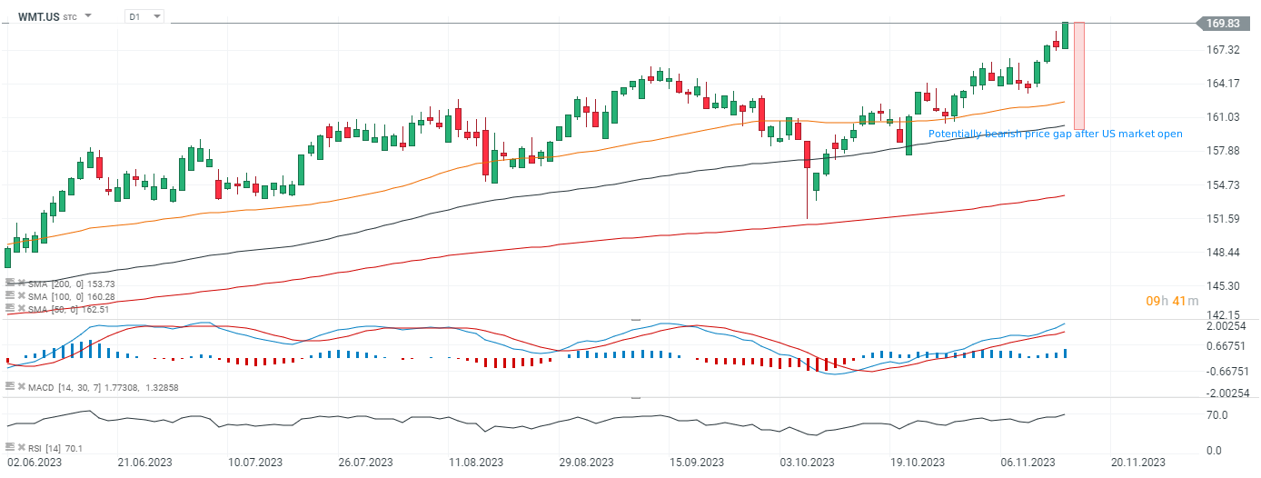 Notowania przed otwarciem rynku wskazują, że akcje Walmartu (WMT.US) otworzą się dziś w okolicach 160 USD za walor. Źródło: xStation5