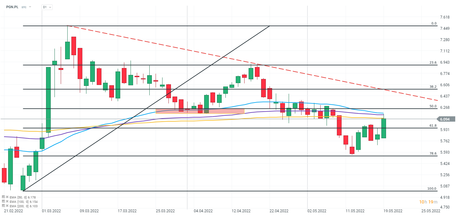 Wykres walorów spółki PGNiG (PGN.PL), interwał D1. W chwili obecnej akcje spółki testują opór tworzony przez 50-, 100- oraz 200- okresowe, wykładnicze średnie kroczące (odpowiednio niebieska, fioletowa oraz złota linia). Dodatkowo strefa ta znajduje się blisko zniesienia 50% fali wzrostowej z końcówki lutego 2022 roku. Najbliższym wsparciem pozostaje zniesienie 61,8% Fibo. Źródło: xStation 5