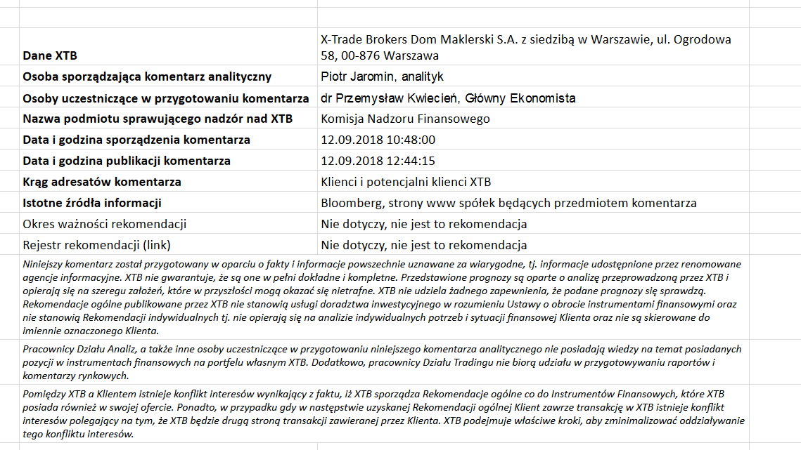 Ta publikacja handlowa jest informacyjna i edukacyjna. Nie jest rekomendacją inwestycyjną ani informacją rekomendującą lub sugerującą strategię inwestycyjną. W materiale nie sugerujemy żadnej strategii inwestycyjnej ani nie świadczymy usługi doradztwa inwestycyjnego. Materiał nie uwzględnia indywidualnej sytuacji finansowej, potrzeb i celów inwestycyjnych klienta. Nie jest też ofertą sprzedaży ani subskrypcji. Nie jest zaproszeniem do nabycia, reklamą ani promocją jakichkolwiek instrumentów finansowych. Publikację handlową przygotowaliśmy starannie i obiektywnie. Przedstawiamy stan faktyczny znany autorom w chwili tworzenia dokumentu. Nie umieszczamy w nim żadnych elementów oceniających. Informacje i badania oparte na historycznych danych lub wynikach oraz prognozy nie stanowią pewnego wskaźnika na przyszłość. Nie odpowiadamy za Twoje działania lub zaniechania, zwłaszcza za to, że zdecydujesz się nabyć lub zbyć instrumenty finansowe na podstawie informacji z tej publikacji handlowej. Nie odpowiadamy też za szkody, które mogą wynikać z bezpośredniego czy też pośredniego wykorzystania tych informacji. Inwestowanie jest ryzykowne. Inwestuj odpowiedzialnie.