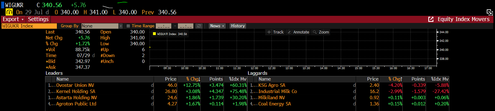 Początek tygodnia na rynkach przyniósł oczekiwania na zaplanowane odpłynięcie pierwszego statku z ukraińskim zbożem do zagranicznego nabywcy. Jak wcześniej zakomunikował Ibrahim Kalin, doradca prezydenta Turcji, szansa na wznowienie eksportu na początku tego tygodnia była duża, a w najgorszym wypadku statki mogły wypłynąć we wtorek. Niemniej pozytywny scenariusz spełnił się i statek Razoni wyruszył w kierunku Trypolisu w Libanie. Między innymi z tego właśnie powody obserwujemy dzisiaj dobre nastroje wśród spółek z indeksu WIG-Ukraina.