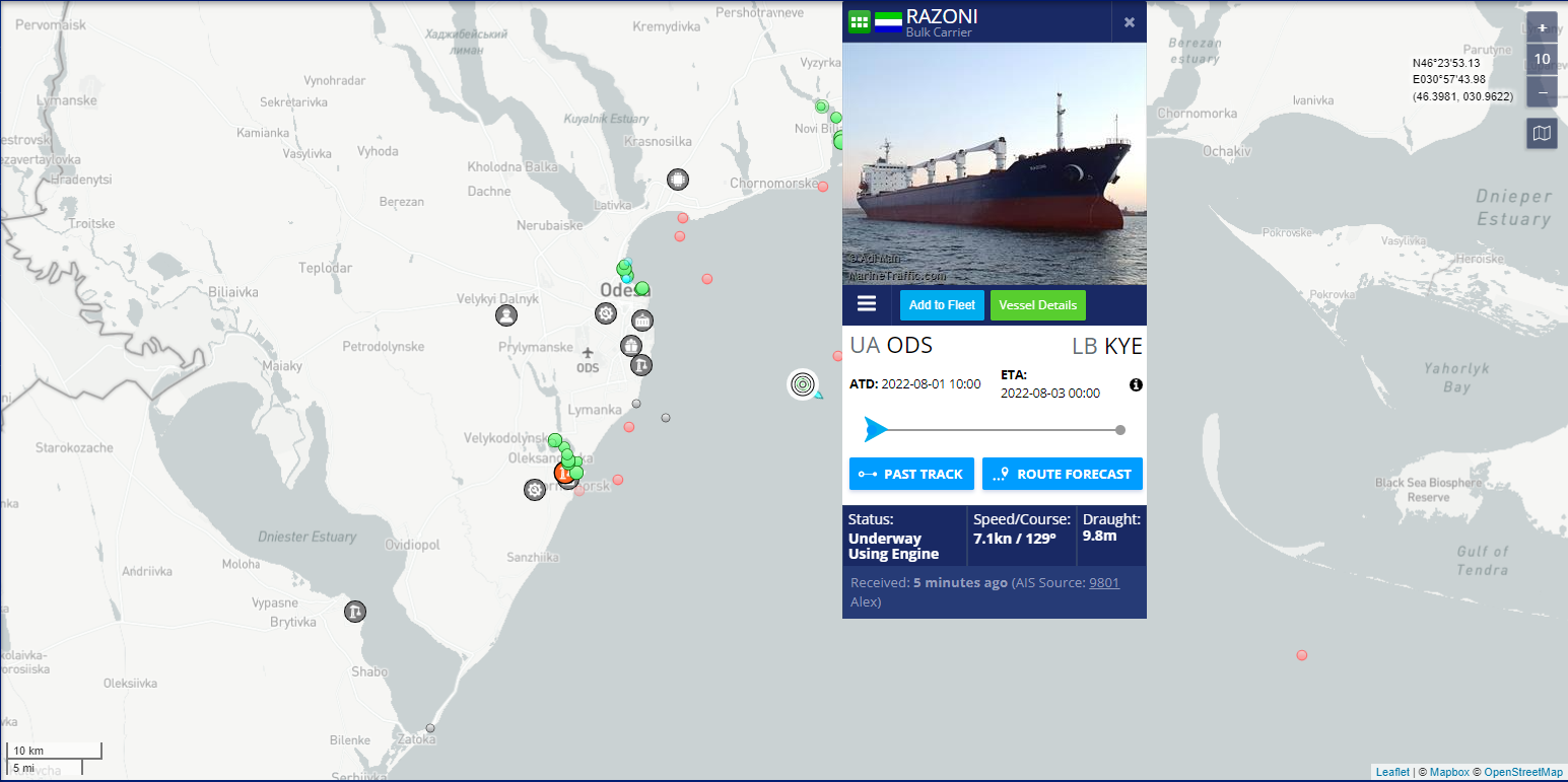 Pierwszy transport zboża odpłynął z portu w Odessie i zmierza do Libanu. Źródło: MarineTraffic