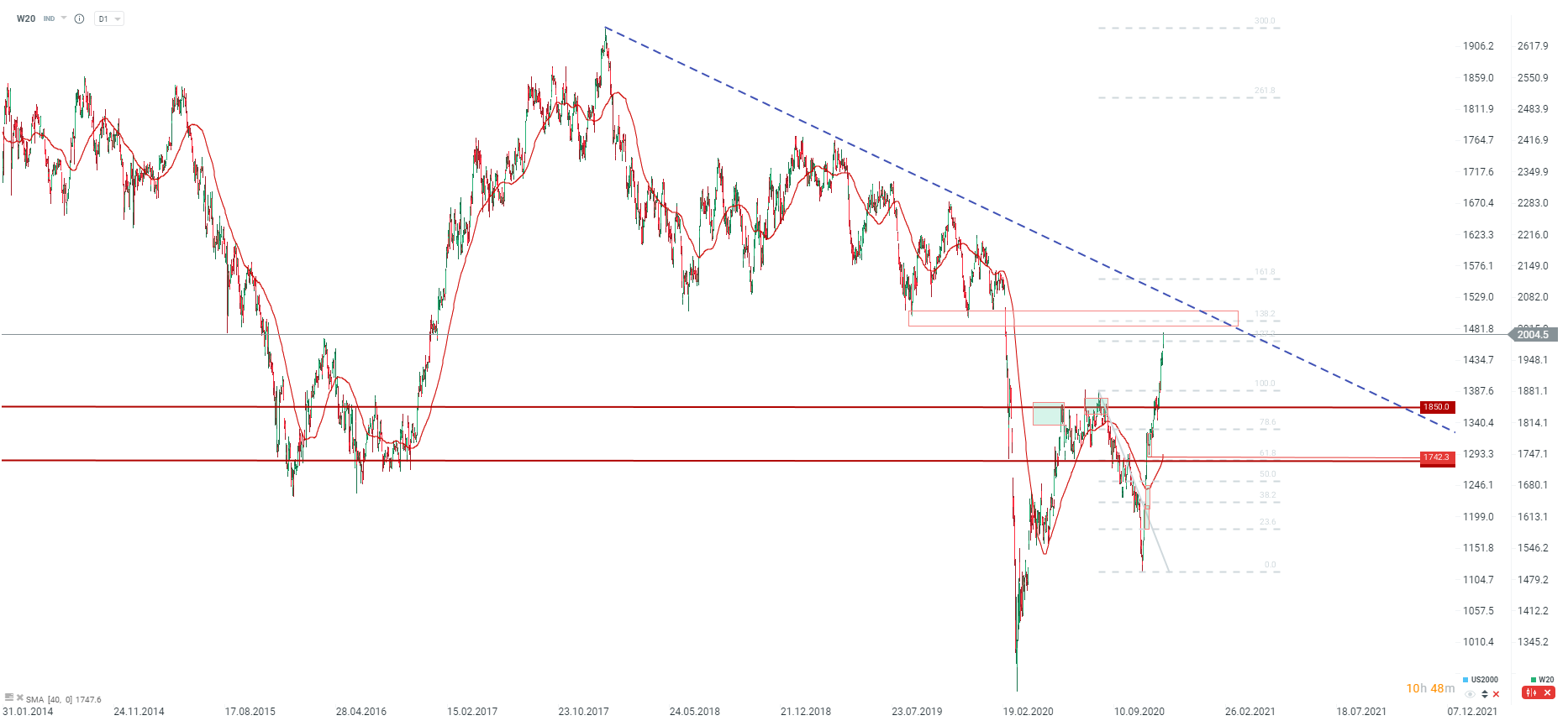 Silny wzrost spółek paliwowych oraz energetycznych powoduje dzisiaj wzrost indeksu WIG20 powyżej 2000 punktów. Widzimy tutaj podwójne zwycięstwo, gdyż kontrakt W20 również przekracza tę barierę, która ostatni raz była widoczna w lutym. Kolejny silny opór na WIG20 to okolice 2050 punktów, czyli lokalne dołki z ostatnich miesięcy 2019 roku, a następnie wieloletnia linia trendu spadkowego.