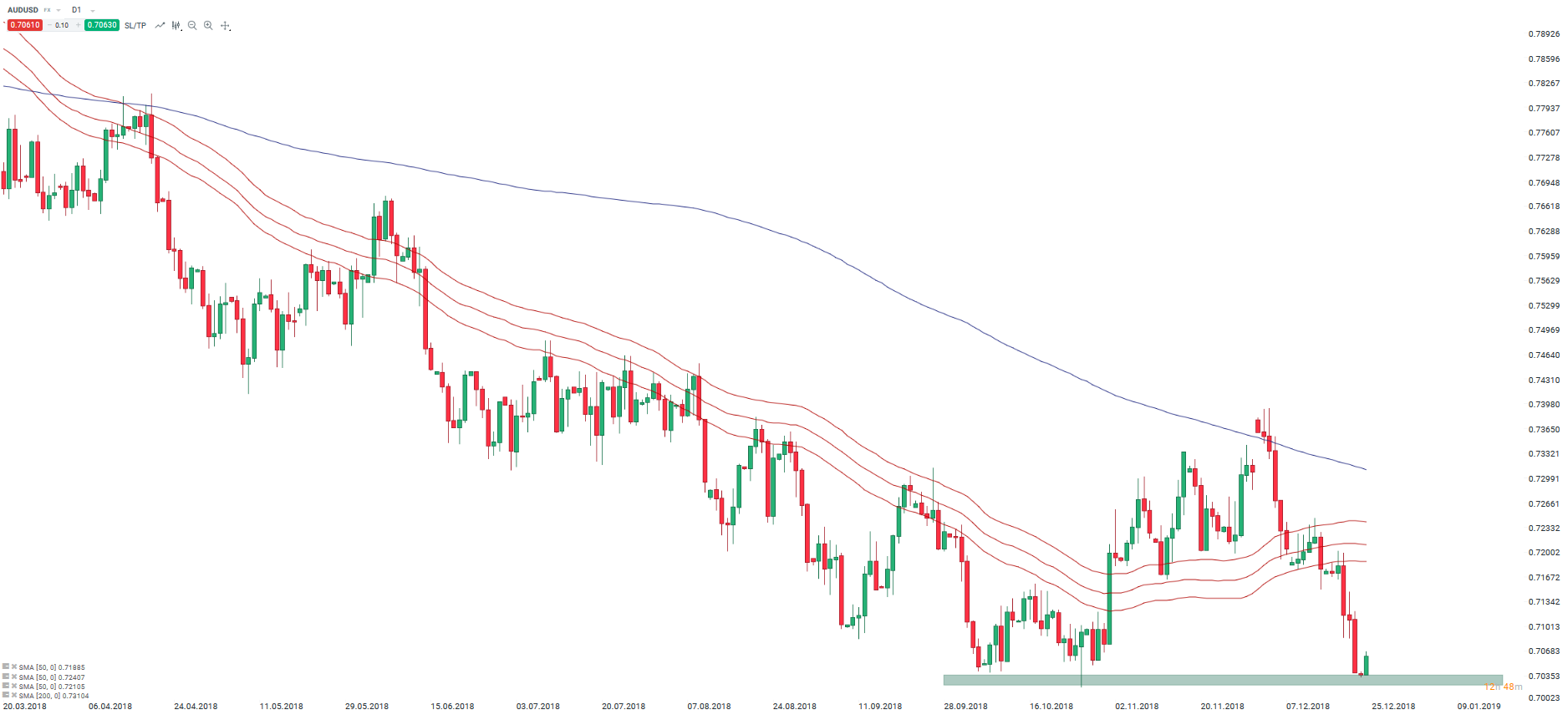 Na rynku walutowym w obliczu świątecznej atmosfery traci amerykańska waluta. Najmocniej wśród najważniejszych walut radzi sobie dolar australijski, który zyskuje po informacjach o tym, że Chiny zamierzają usunąć taryfy celne na rudy żelaza (oraz na 93 innych produktów) od 1 stycznia 2019 roku. Warto przypomnieć, że cen rud żelaza są mocno powiązane z wartością dolara australijskiego, a Chiny są znaczący importerem rud z Australii. W wyniku delikatnej poprawy sentymentu, widzimy wzrosty na amerykańskich kontraktach, jednak nie są one znaczące w obliczu poprzednich spadków.