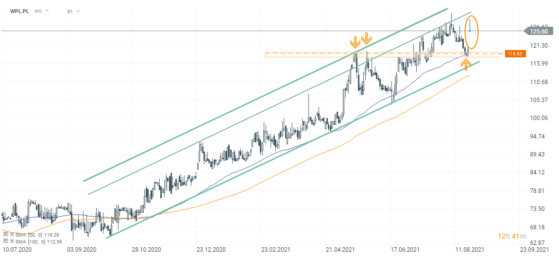 Na wykresie Wirtualnej Polski widać jest bardzo wyraźny trend wzrostowy. Kurs do tej pory respektuje linię trendu wzrostowego, a w ostatnich miesiącach ważną strefą cenową były okolice 118,80 PLN - w maju poziom dwukrotnie zadziałał jako opór, a w ostatnich dniach posłużył jako wsparcie. Dzisiejsze odbicie oddala uwagę od linii trendu wzrostowego i może potencjalnie skłonić rynkowych byków to zaatakowania niedawnych szczytów (maksima intraday to 130,60 PLN).