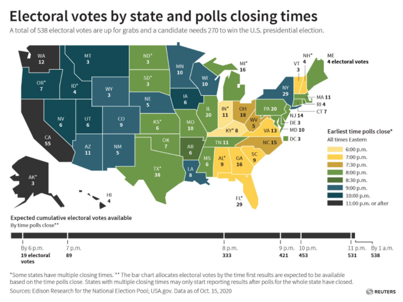 Tymczasem zmienność na rynkach zamarła. Teoretycznie w przeciągu najbliższych 30-40 minut powinniśmy spodziewać się wstępnych wyników z niektórych stanów. Przypominamy mapkę: