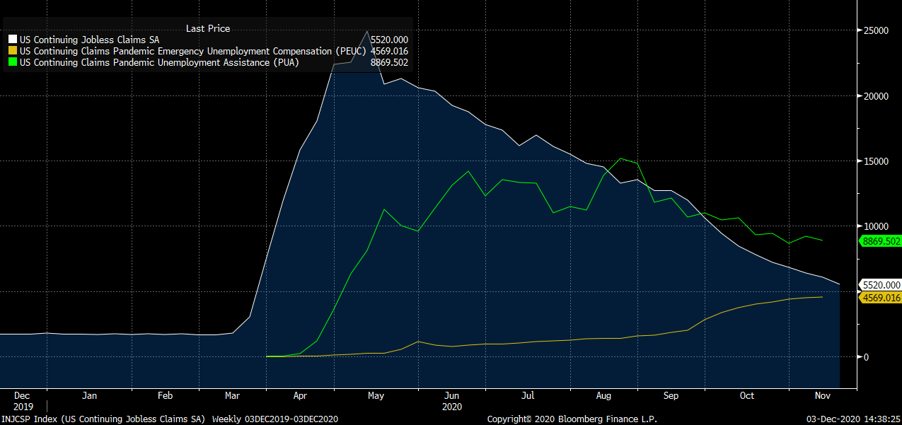 Wnioski o zasiłek dla bezrobotnych kontynuacyjne spadają, ale istnieje duże prawdopodobieństwo, że te powiązane z pandemią (PEUC) wzrosły kolejny raz. Widać silnie odwrotną korelację w przypadku tych dwóch figur od końca września. Źródło: Bloomberg