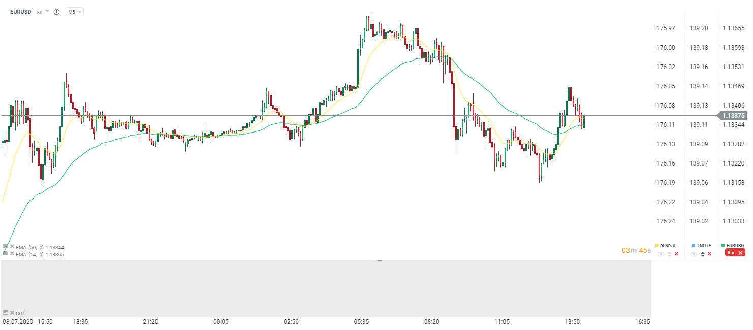 EURUSD odbija w ostatnich minutach, choć generalnie dolar próbuje dzisiaj zyskiwać. Do godzin późnoporannych obserwowaliśmy raczej mocniejszego dolara. Źródło: xStation5