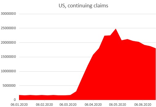 Wnioski kontynuacyjne, czyli składane już przez ludzi, którzy pobierali wcześniej świadczenia wypadła na poziomie 18,062 mln, lepiej od oczekiwanaego poziomu 18,950 mln. Poprzednio było to 18,760 mln. Wobec czego oczekiwano wzrostu. Warto zauważyć, że wnioski kontynuacyjne dotyczą okresu sprzed dwóch tygodni.